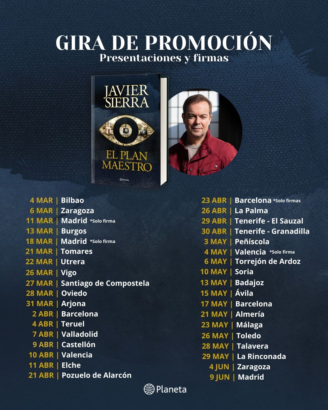 Javier Sierra arranca una intensa gira de presentaciones por toda España de su nueva novela. Comprueba si tu ciudad está en la lista y anótatelo en tu agenda. Las presentaciones de Javier son cautivadoras y en ellas descubrirás detalles sobre el proceso de investigación y escritura de su nueva novela que te asombrarán. Casi 40 actos públicos de entrada libre, entre marzo y junio de 2025, te acercarán a los secretos de El plan maestro.